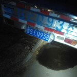 车斜着停在路肩上,油从油箱口流了出来。